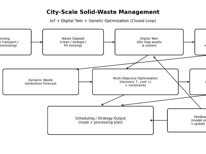 CN119273110A describes a closed-loop waste management method that combines IoT sensing, a capacity-aware digital twin (with risk bounds), and genetic multi-objective optimization to produce actionable scheduling strategies under constraints.