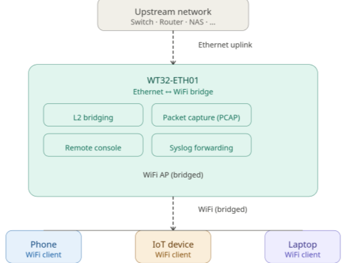 공개 설명 기준으로는 WiFi 클라이언트가 upstream DHCP 서버에서 IP를 받고, 유선 쪽에서 직접 접근 가능하도록 만드는 것이 목표입니다. 이 요구는 NAT 라우터보다 Layer 2 브리지에 더 잘 맞습니다. 추론임: 장비 자동 검색, DHCP, ARP, 브로드캐스트 기반 프로토콜을 그대로 통과시키려는 목적이 설계 배경으로 볼 수 있습니다.