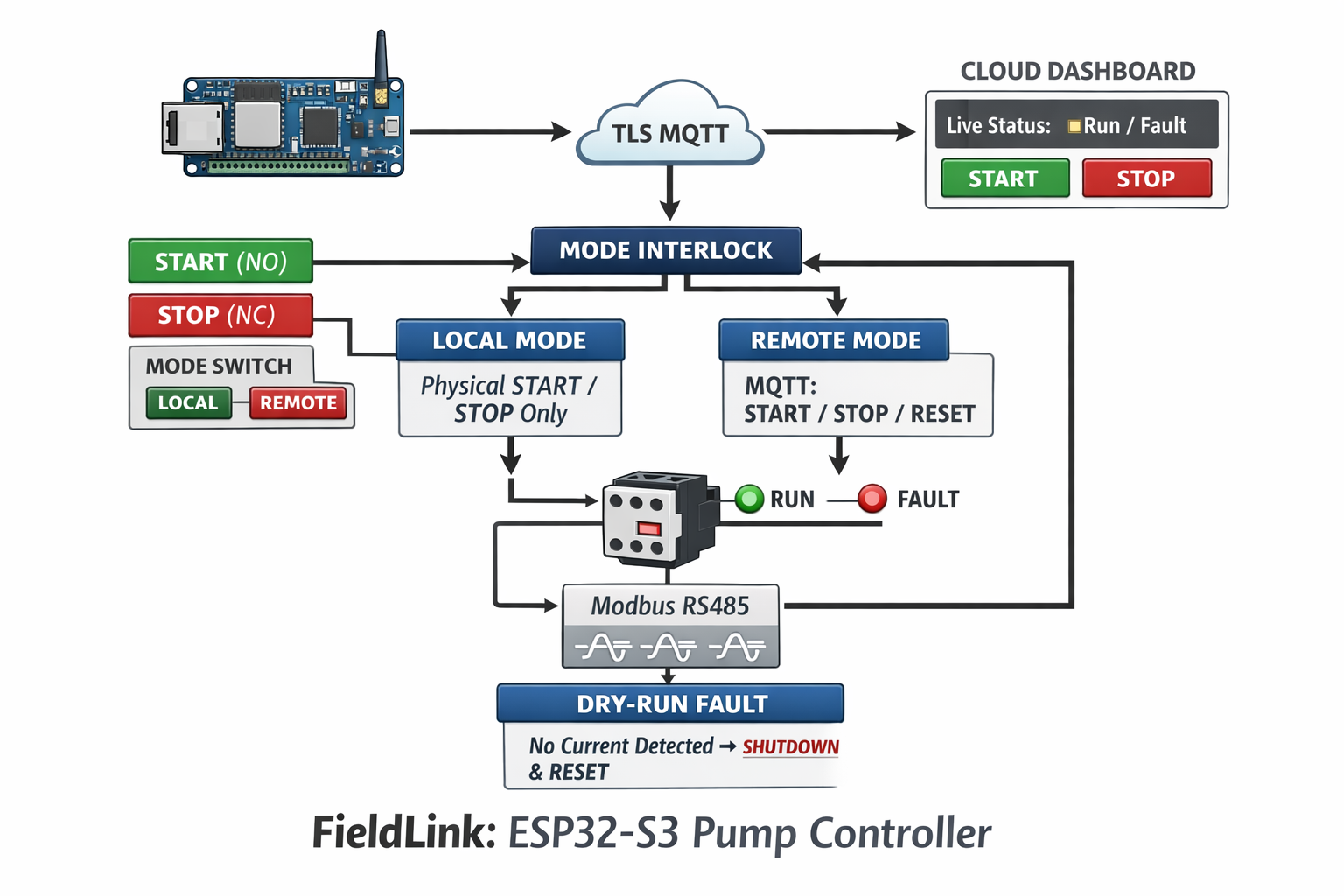 FieldLink is a small industrial controller pattern: keep the “must-not-fail” actions local and deterministic (physical STOP, mode interlock), then layer cloud visibility and optional remote control on top. It reports three-phase current (Ia/Ib/Ic) via Modbus RS485, publishes telemetry to MQTT over TLS, and drives a contactor output plus RUN/FAULT indicators.
