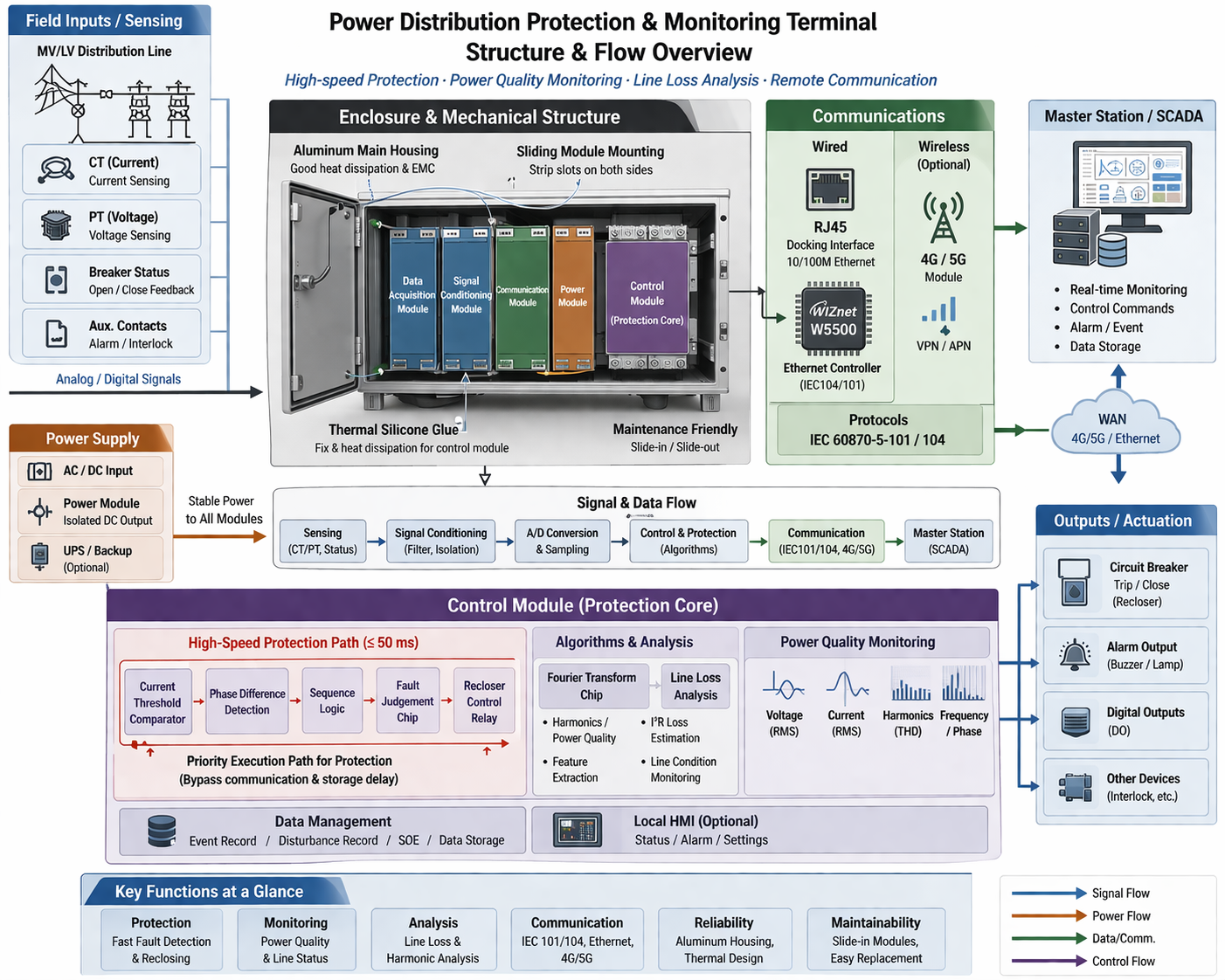 This utility model packages protection, power-quality monitoring, line-loss analysis, and mixed wired/wireless links into a modular field unit built for service