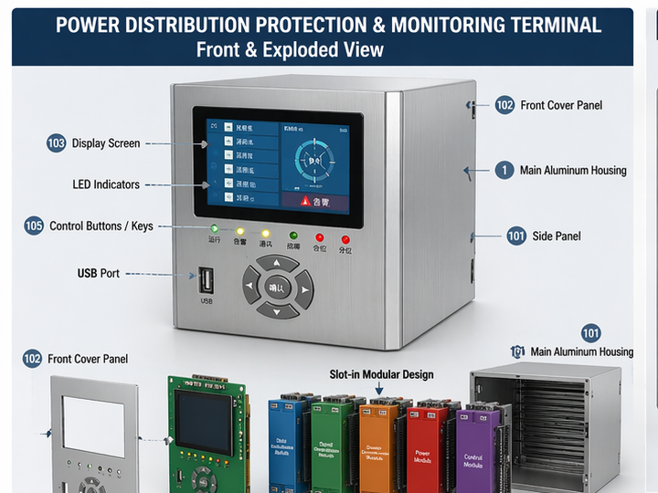 The document’s main engineering move is not a novel standalone algorithm, but a re-packaging of several distribution-side functions into a serviceable hardware layout. The background section criticizes conventional devices for bolt- or weld-fixed modules, weak vibration tolerance, poor sealing, weak heat dissipation, confusing front-panel layout, and overly narrow communication choices. In response, the patent proposes slot-based modular mounting inside an aluminum housing, with the display, warning lights, and control buttons aligned through dedicated openings on the cover-mounted control panel.