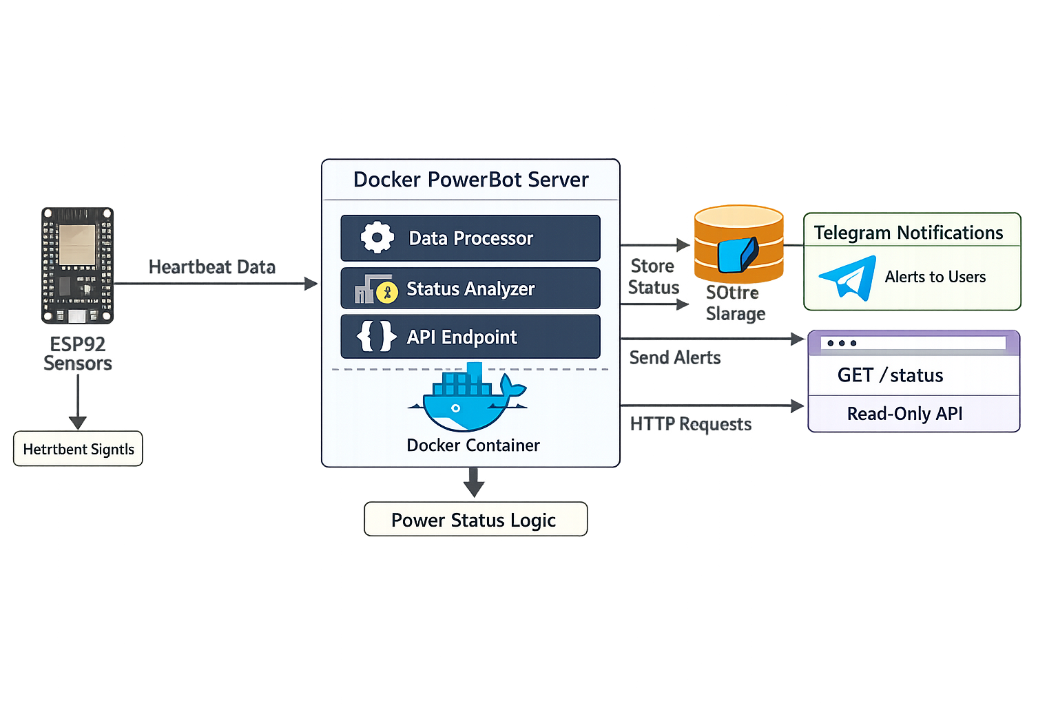 Docker-deployed Telegram bot infers building power status from ESP32 heartbeats, stores in SQLite, notifies users, and exposes a read-only HTTP status API.