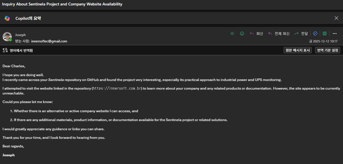 이에 따라, GitHub에 공개된 연락처 이메일innersoftec@gmail.com을 통해