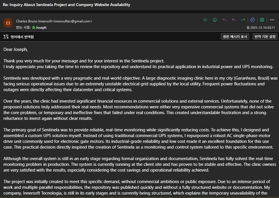 요약하면 프로젝트 목표를 달성하고 현장에서 안정적으로 운영 중이고, 다만, 회사(Innersoft Tecnologia)가 아직 초기 단계로 웹사이트가 일시적으로 비활성화 된 상태라고 합니다. 이런 관심에 감사드리며 조만간 기술문서, 배포 세부사항 등의 문서를 보강할 예정이라고 합니다.