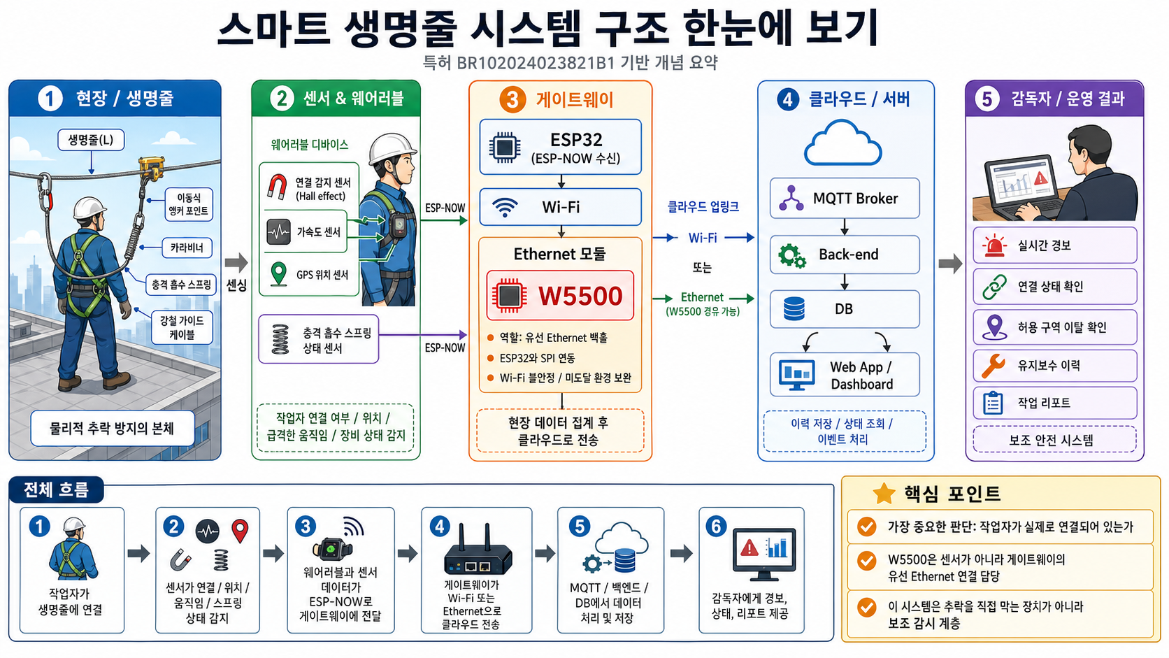 WIZnet 관점에서는 W5500이 시스템의 주인공은 아닙니다. 주인공은 생명줄 안전 감시 구조입니다. 하지만 W5500은 게이트웨이가 Wi-Fi에만 의존하지 않도록 유선 Ethernet 선택지를 제공하는 구성요소로 의미가 있습니다. 특허 문서에서도 W5500은 ESP32와 SPI로 통합 가능한 Ethernet 칩 예시로 언급됩니다.
