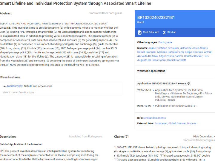 BR102024023821B1 describes an intelligent lifeline system for work-at-height safety. The disclosed system aims to monitor whether a worker is properly connected to a lifeline, whether the worker is operating within an allowed area, and whether maintenance-related conditions, such as shock absorber activation, require attention. The system is described as a combination of sensors, an electronic data collection device, cloud-connected software, reporting functions, and alerts.
