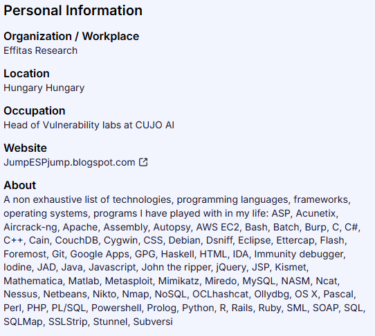 현재 공개적으로 확인되는 대표 직함은 CUJO AI의 Head of Vulnerability Research입니다. HITB 2023 발표자 소개에 따르면, 그는 홈 IoT 보안을 다루는 CUJO AI에서 취약점 연구를 이끌고 있습니다. 그 이전에는 AV 테스트 회사 CTO, 금융권 IT 보안 전문가, 그리고 Big Four 계열의 시니어 IT 보안 컨설턴트로 일한 경력이 소개되어 있습니다.