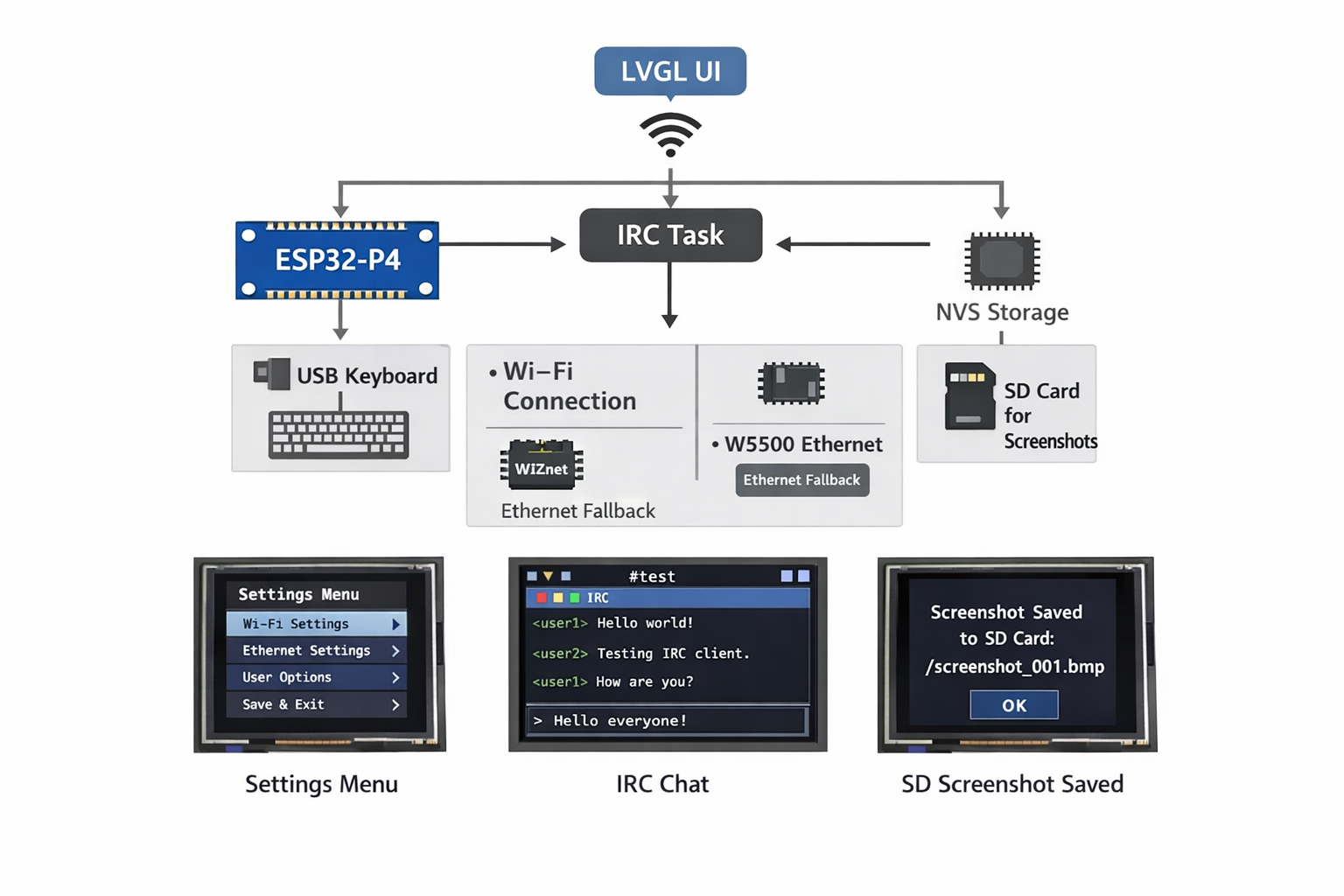The public repository family suggests a separation between UI, input adaptation, and transport. A keyboard-to-LVGL bridge exists as a standalone component, while the W5500 transport support is separated into its own Ethernet driver component. That modularity implies that the IRC client can stay focused on application flow instead of embedding every hardware detail directly into one file or task.