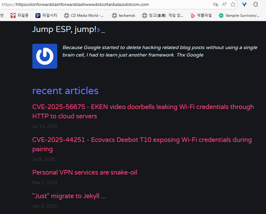 개인 블로그 “Jump ESP, jump!” 에서도 이런 성향이 그대로 드러납니다. 최근 공개 글만 봐도 EKEN 비디오 도어벨과 Ecovacs Deebot T10의 Wi-Fi 자격 증명 노출 문제처럼, 실제 기기와 프로토콜, 네트워크 동작을 분석하는 글이 올라와 있습니다. 블로그 첫 화면의 소개 문구도, 기존 플랫폼에서 해킹 관련 글이 삭제되기 시작해 독립 블로그로 옮겨 왔다는 맥락을 직접 드러내고 있어서, 단순한 링크 보관소가 아니라 지속적으로 기술 글을 쓰는 연구자형 블로그라는 점이 분명합니다.