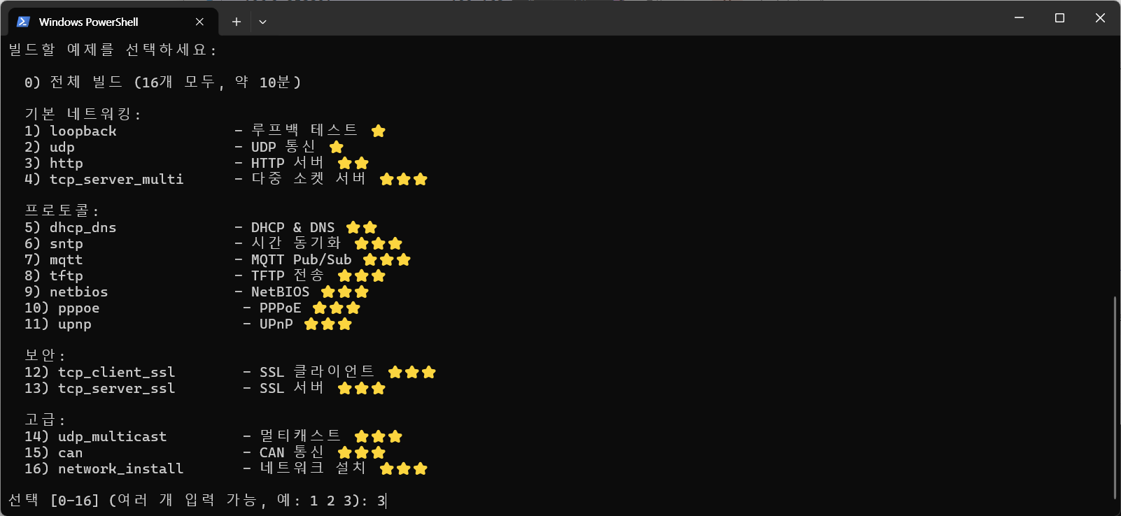 0: 전체 16개 예제 빌드 (약 10분)1-16: 특정 예제 빌드- 다중 선택: