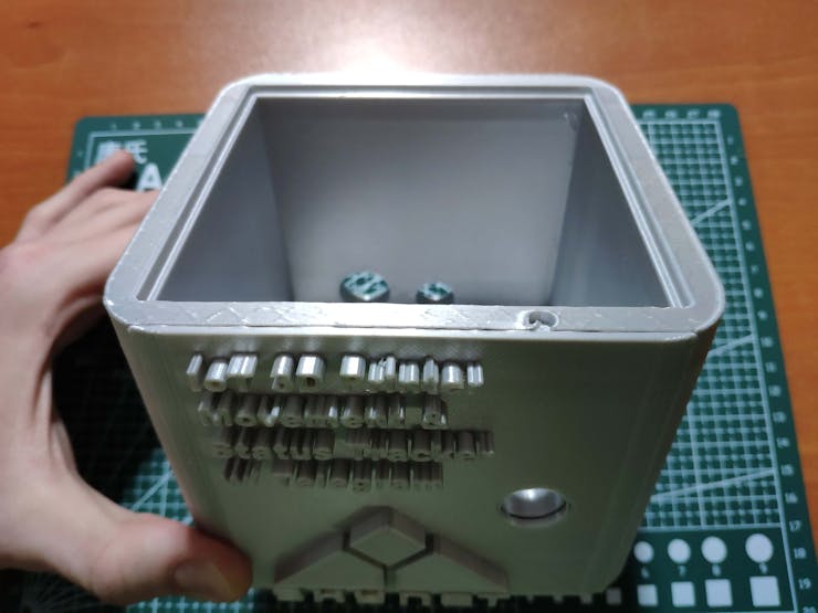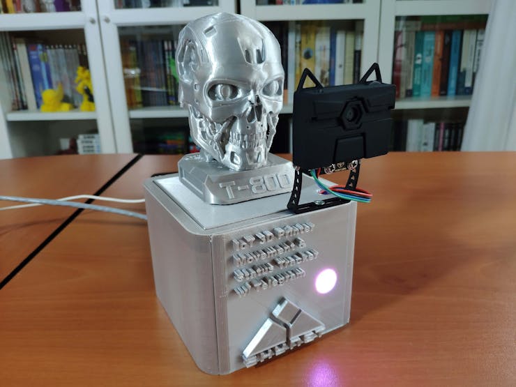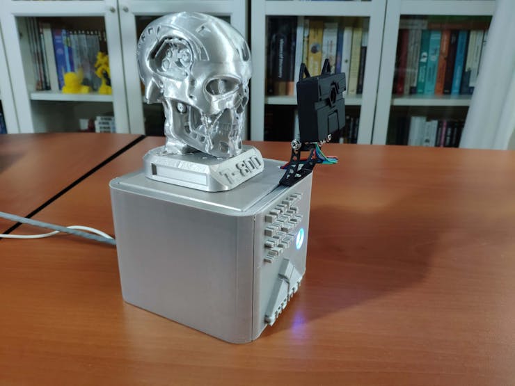 Since I wanted to place the device towards my FDM 3D printer while printing 3D models in my workshop, I decided to design a complementing metallic case to create a robust and sturdy mechanism operating flawlessly. To make device connections more accessible, I added a removable top cover to the case. Then, I got inspired by The Terminator to add a T-800 replica to the device since it aims to track the movements of the printer and detect potential malfunctions to eliminate them :)