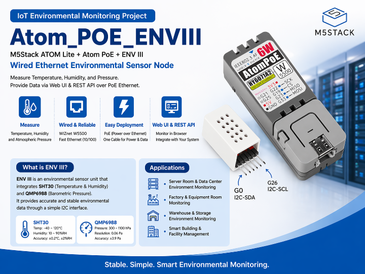 Atom_POE_ENVIII is a wired environmental monitoring project that delivers ENV III sensor data through WIZnet W5500 Ethernet and PoE for stable, installation-fri