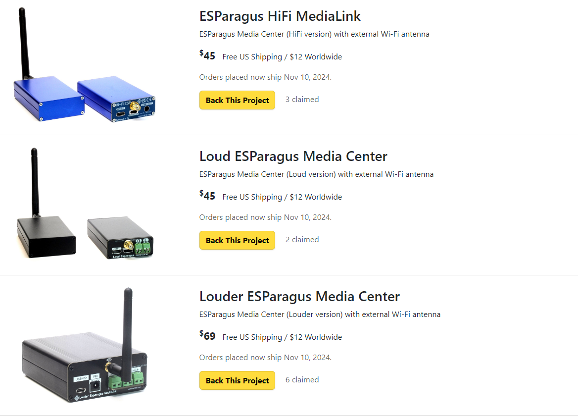 ESParagus Media Center is a line of three ESP32-based audio products that provide cutting-edge streaming capabilities to modernize aging stereo speaker systems. These standalone devices draw very little power when idle, boot up in seconds, and connect quickly and easily to your existing HiFi system or smart-home ecosystem.