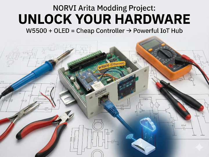 This project unlocks a cheap NORVI Arita controller by adding a W5500 Ethernet module and OLED, transforming it into a powerful IoT hub through custom firmware.