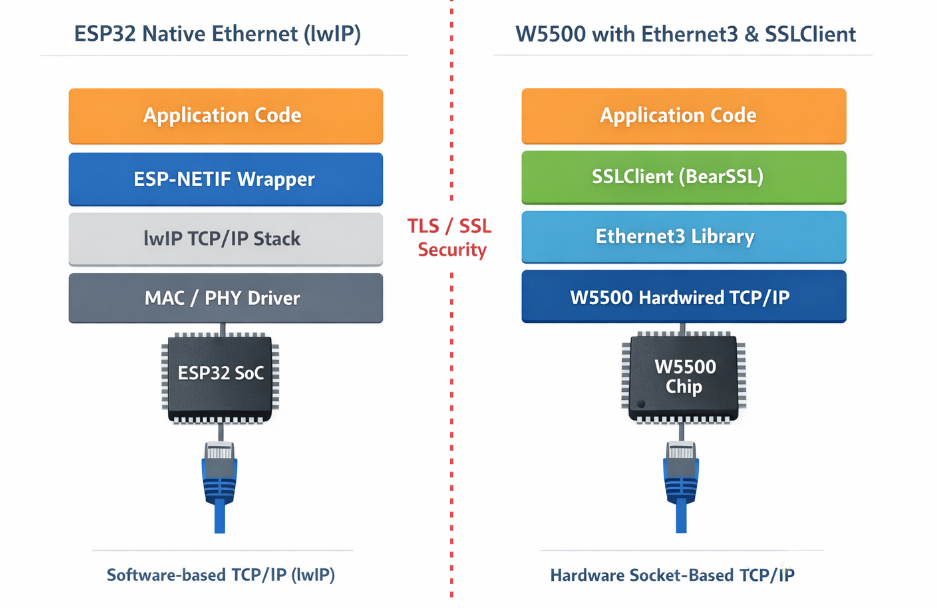 EthernetClientSecure is designed around EthernetClient and SSLClient, not around the ESP32’s native lwIP-based Ethernet stack. In this project structure, Ethernet transport is handled through the underlying Ethernet client layer, while TLS is added by SSLClient on top. This makes the library especially suitable for W5500-based hardware socket Ethernet designs rather than a native lwIP-centered software networking path.