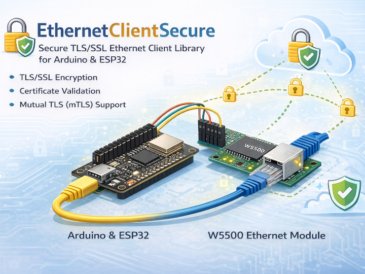 EthernetClientSecure is a secure Ethernet client library for Arduino and ESP32 that adds TLS/SSL support over Ethernet connections. It wraps SSLClient and EthernetClient to provide certificate validation and optional mutual TLS (mTLS) support in a simple embedded-friendly interface.