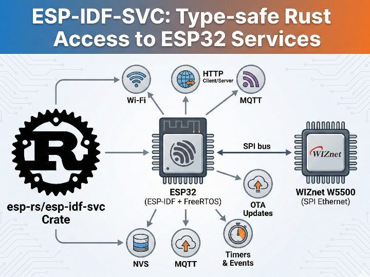 esp-rs/esp-idf-svc is a high-level Rust crate that provides safe, idiomatic wrappers around ESP-IDF services—things you actually use in real products such as timers, event loop, Wi-Fi, Ethernet, HTTP client/server, MQTT, NVS, OTA, and more. It does this largely by implementing the embedded-svc traits on top of ESP-IDF, so Rust applications can consume ESP-IDF capabilities with a more consistent, type-safe API surface.