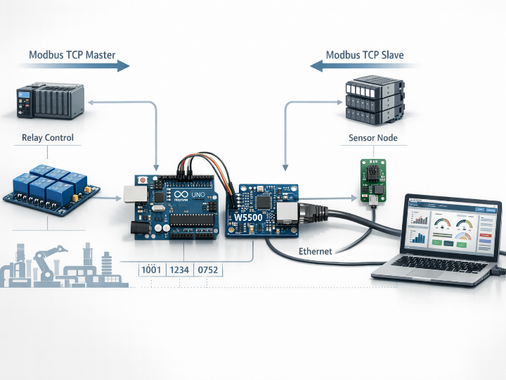 This project is useful when a small embedded device needs to expose data or accept control commands over industrial Ethernet using Modbus TCP. Typical use cases include relay control nodes, simple sensor gateways, Modbus test benches, and Arduino-based field devices that need to communicate with PLCs, HMIs, or SCADA systems. The included examples cover relay control, HTU21D sensor data mapping, and direct Master-to-Slave communication without SCADA.