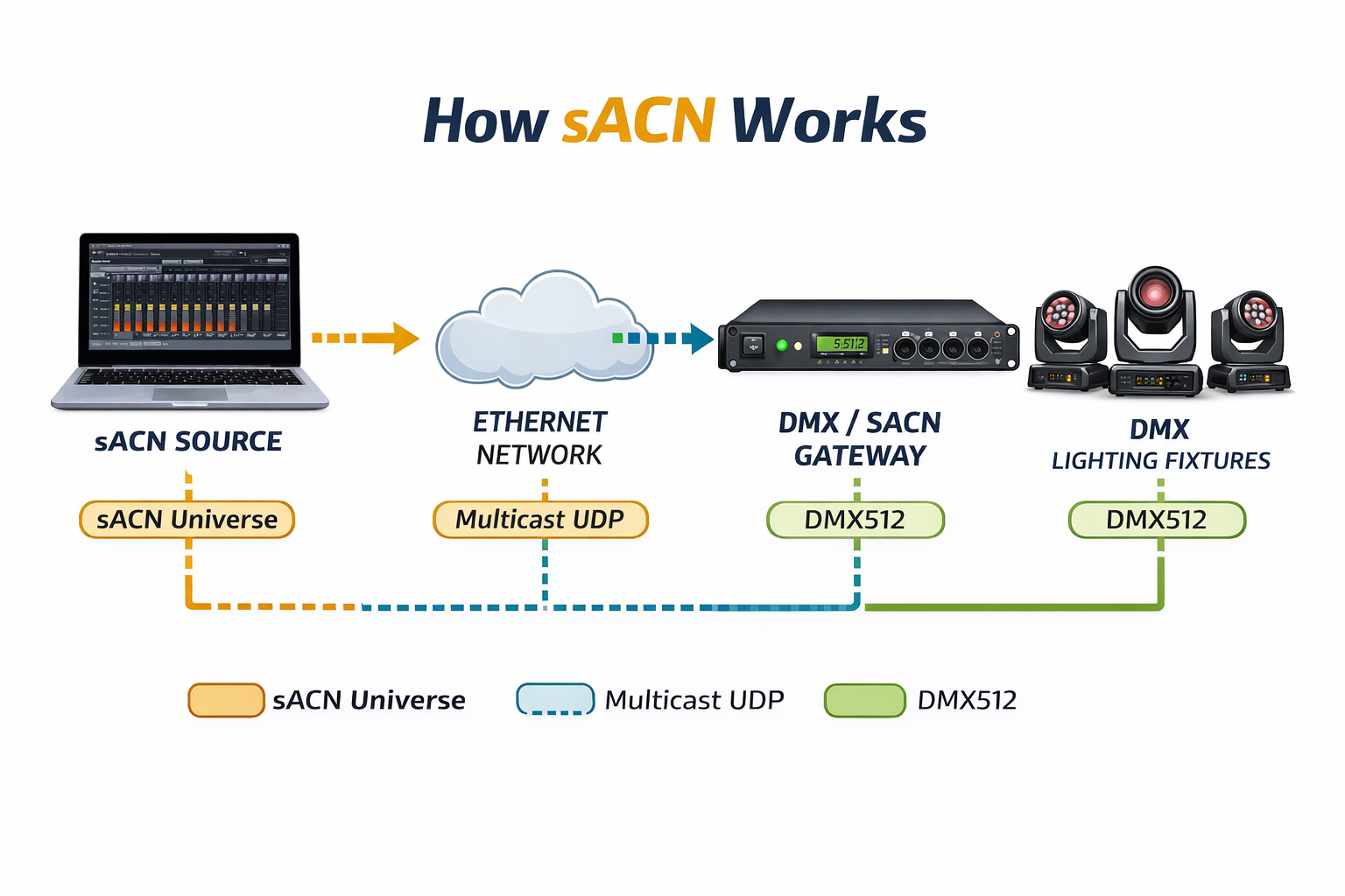 DMX512 is a traditional serial lighting control protocol, while sACN sends the same type of lighting data over an IP network. This makes sACN more flexible for longer distances, multi-device networks, and software-based lighting systems.