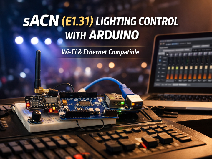 It is a lightweight Arduino library that generates sACN (E1.31) packets and sends them over UDP. Rather than implementing a full lighting control system, it focuses on one simple task: sending DMX channel data through a network-based lighting protocol.