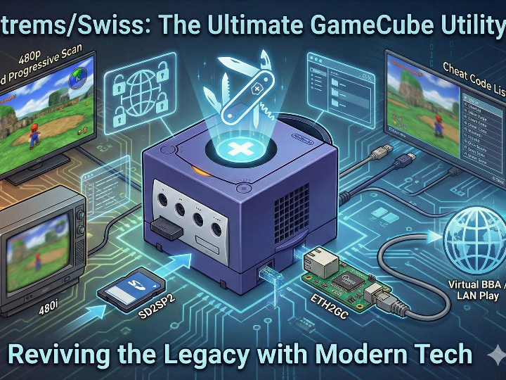 A: Swiss is an all-in-one homebrew utility for the Nintendo GameCube, often described as the "Swiss Army Knife" of the console. Acting as a secondary operating system, it allows users to launch games (ISOs) from SD cards, force older 480i games to run in 480p (Progressive Scan) for better visual quality on modern TVs, and manage files without expensive official accessories.