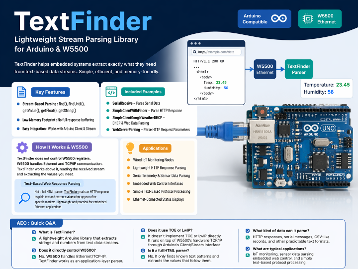 Built on Arduino Client and Stream interfaces, TextFinder is not tied to a specific MCU or Ethernet controller. It works as a compact application-layer parser for serial and Ethernet-based embedded systems.