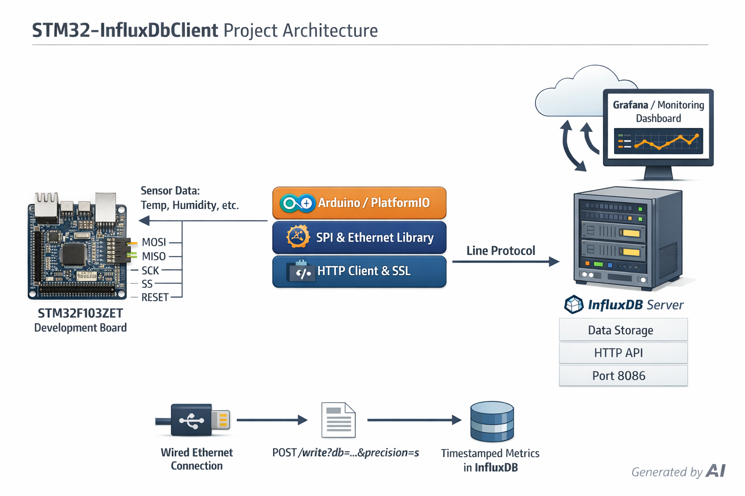 STM32-InfluxDbClient is a project that uses the STM32F103ZET development board and the W5100 Ethernet controller to send metric data generated by an embedded device directly to InfluxDB over a wired network. The repository describes it as an InfluxDB metric transmission example based on an “STM32F103ZET board + W5100 Ethernet Controller (wired),” and the platformio.ini file is configured for the genericSTM32F103ZE board with the Arduino framework.