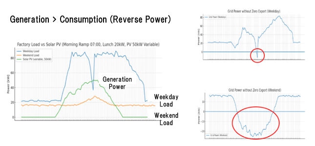 When power consumption (load) is lower than generation—such as on holidays, late at night, or during lunch breaks—surplus electricity flows backward into the KEPCO grid. This is known as 'Reverse Power'. It degrades power quality by raising grid voltage and can lead to serious legal issues or safety accidents.