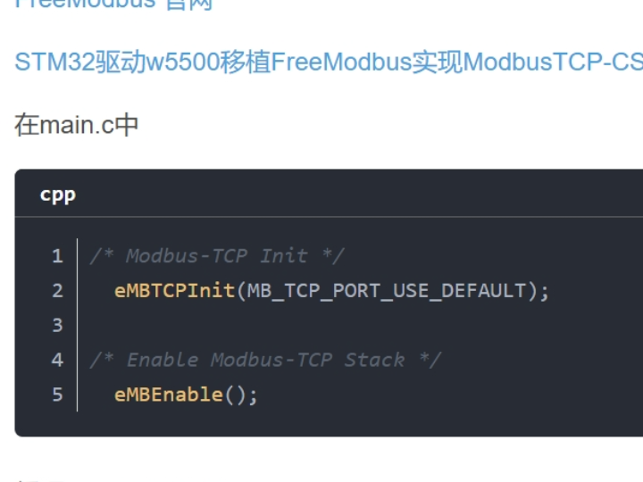 The same article then extends the design into Modbus/TCP using FreeModbus. In main.c, it initializes the Modbus/TCP stack with eMBTCPInit(MB_TCP_PORT_USE_DEFAULT), enables it with eMBEnable(), and runs eMBPoll() in the main loop. It also patches portevent.c so the port layer can trigger TCP polling through xMBPortTCPPool(), and it says a porttcp.c file must be added. For a maker project, that is the important architectural jump: the W5500 does not stop at raw TCP echo or a custom server; it becomes the network transport under a standard industrial application protocol.