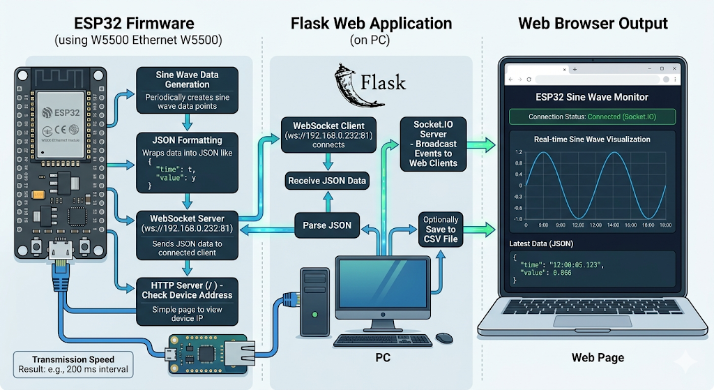 사인파 데이터를 브라우저에 직접 그리는 것이 아니라, ESP32가 JSON 페이로드를 생성해 WebSocket 서버로 송신할 수 있도록 유선 네트워크 인터페이스를 제공합니다. 이후 Flask 앱이 해당 소켓에 접속해 데이터를 받아 화면과 CSV로 넘깁니다. 즉 W5500의 기능적 위치는 “센서/신호 생성 장치와 시각화 서버 사이의 유선 transport 계층”입니다.