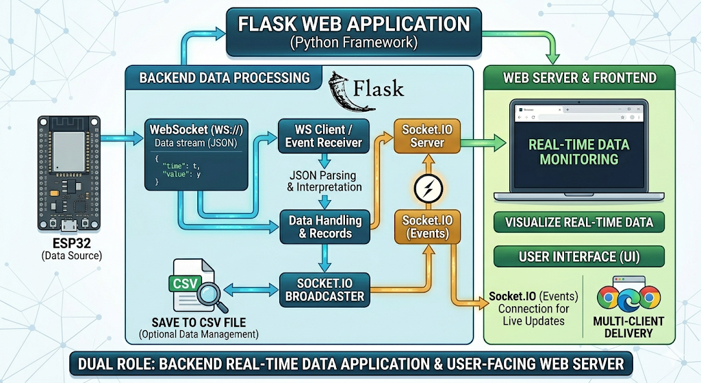 Flask 앱은 Python의 Flask 프레임워크로 작성된 웹 애플리케이션입니다. 이 프로젝트에서는 단순한 웹페이지 표시용 프로그램이 아니라, ESP32에서 전달된 데이터를 받아 처리하고 브라우저 화면에 보여주는 서버 역할을 합니다. Flask 앱은 ESP32가 보내는 WebSocket 데이터를 수신하고, 이를 JSON으로 해석한 뒤 웹 클라이언트가 보기 쉬운 형태로 다시 전달합니다. 필요에 따라 CSV 파일로 저장하는 기능도 포함할 수 있어, 단순 시각화뿐 아니라 기록과 데이터 관리에도 활용됩니다. 즉 이 프로젝트에서 Flask 앱은 사용자 화면을 제공하는 웹 서버이면서, 동시에 실시간 데이터를 처리하는 백엔드 애플리케이션이라고 보시면 됩니다.