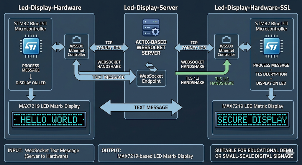 이 저장소는 크게 세 부분으로 구성됩니다. led-display-hardware는 STM32 Blue Pill, W5500, MAX7219 LED 매트릭스를 사용하는 임베디드 펌웨어이며, led-display-server는 Actix 기반의 WebSocket 서버입니다. 여기에 더해 led-display-hardware-ssl은 동일한 하드웨어 구조 위에 TLS 1.2를 추가한 확장 버전입니다.