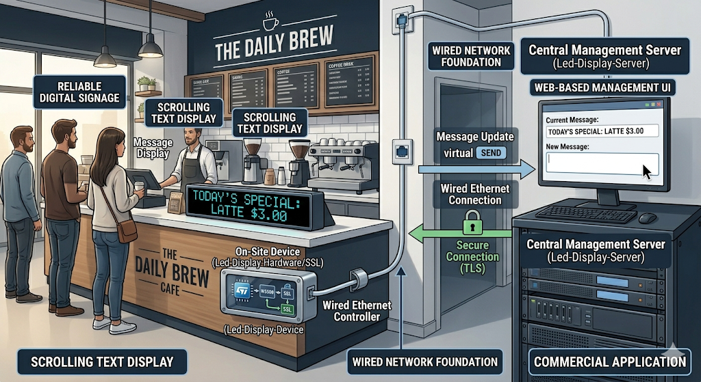 이 구조는 교육용 데모로도 적합하지만, 상업용 관점에서 보면 유선 네트워크 기반 소형 디지털 사이니지의 축소판으로 이해하셔도 무방합니다. 서버에서 문구를 보내고, 현장 장치가 이를 받아 안정적으로 표시하는 구조이기 때문입니다.