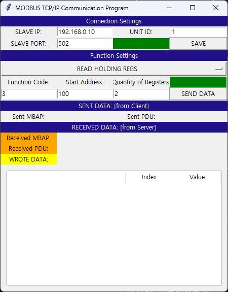 이 GUI는 Python으로 작성된 Modbus TCP 마스터 도구입니다. 사용자가 슬레이브 IP, 포트, 주소, 수량 등을 입력하면 이를 바탕으로 요청 프레임을 만들고 MCU 슬레이브에 TCP로 전송합니다.