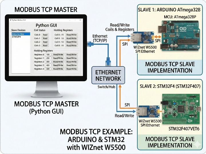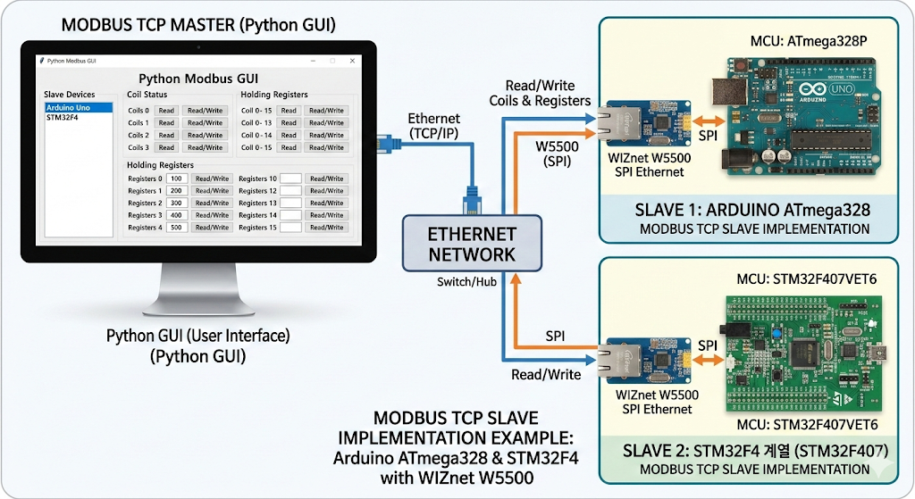 This project demonstrates how to implement Arduino ATmega328 and STM32F4-series MCUs as Modbus TCP slaves, while using a Python GUI as the master to read and write coils and registers. The WIZnet W5500 handles wired Ethernet communication on the MCU side, and the Python GUI serves as a test and control tool that generates and sends Modbus TCP requests from a host PC. According to the repository description, the project was implemented directly from the protocol documentation without relying on an external Modbus library.