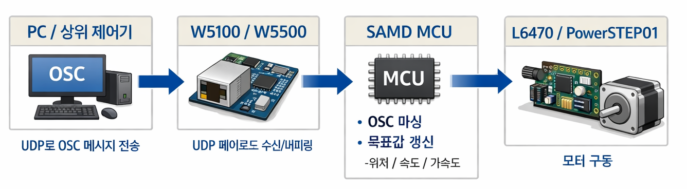 SAMD MCU → OSC 파싱 → 축별 목표값(위치/속도/가속도) 갱신