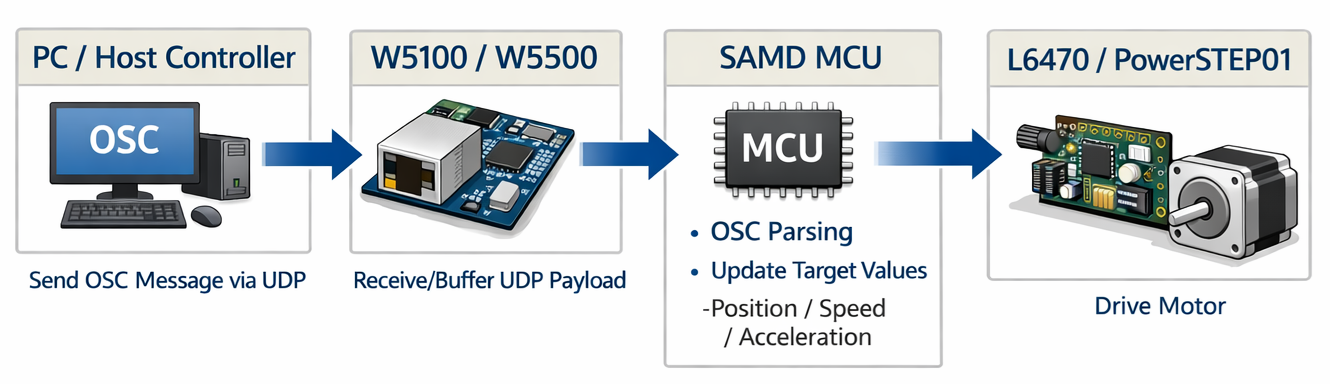 SAMD MCU → parses OSC → updates per-axis targets (position/velocity/acceleration)