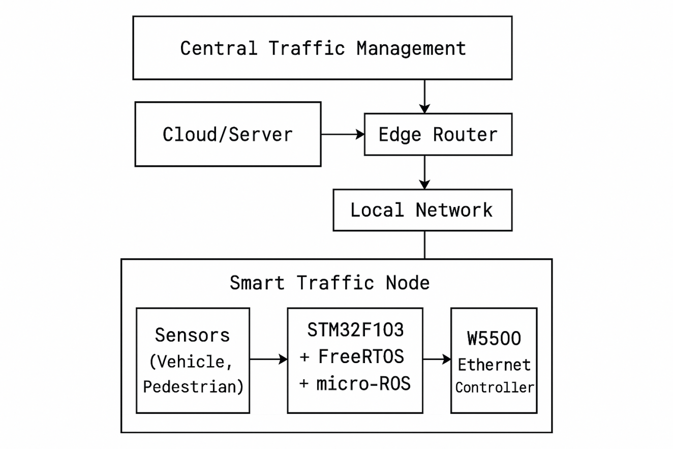 Smart Traffic Node (본 프로젝트) 센서(차량/보행자) 입력 수집 STM32F103 + FreeRTOS + micro-ROS에서 로컬 의사결정 W5500 이더넷으로 중앙 시스템과 ROS 2 메시지 교환 이 구조는 “클라우드는 두뇌, 엣지는 반사신경” 같은 역할 분리를 원하는 스마트 시티 아키텍처에 잘 맞습니다.