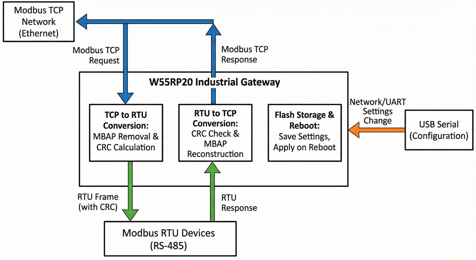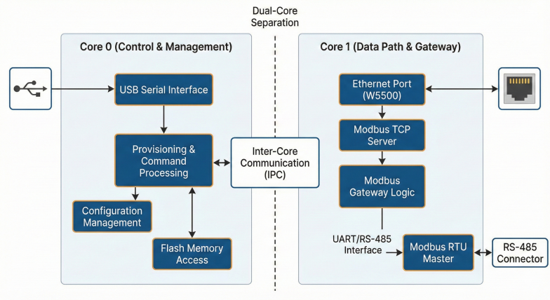 The key point of this design is using the W5500 hardware TCP/IP stack (hardware sockets) inside the W55RP20, so the MCU can focus on core gateway tasks—such as Modbus conversion, timeouts, and queue handling—rather than implementing a full software network stack.