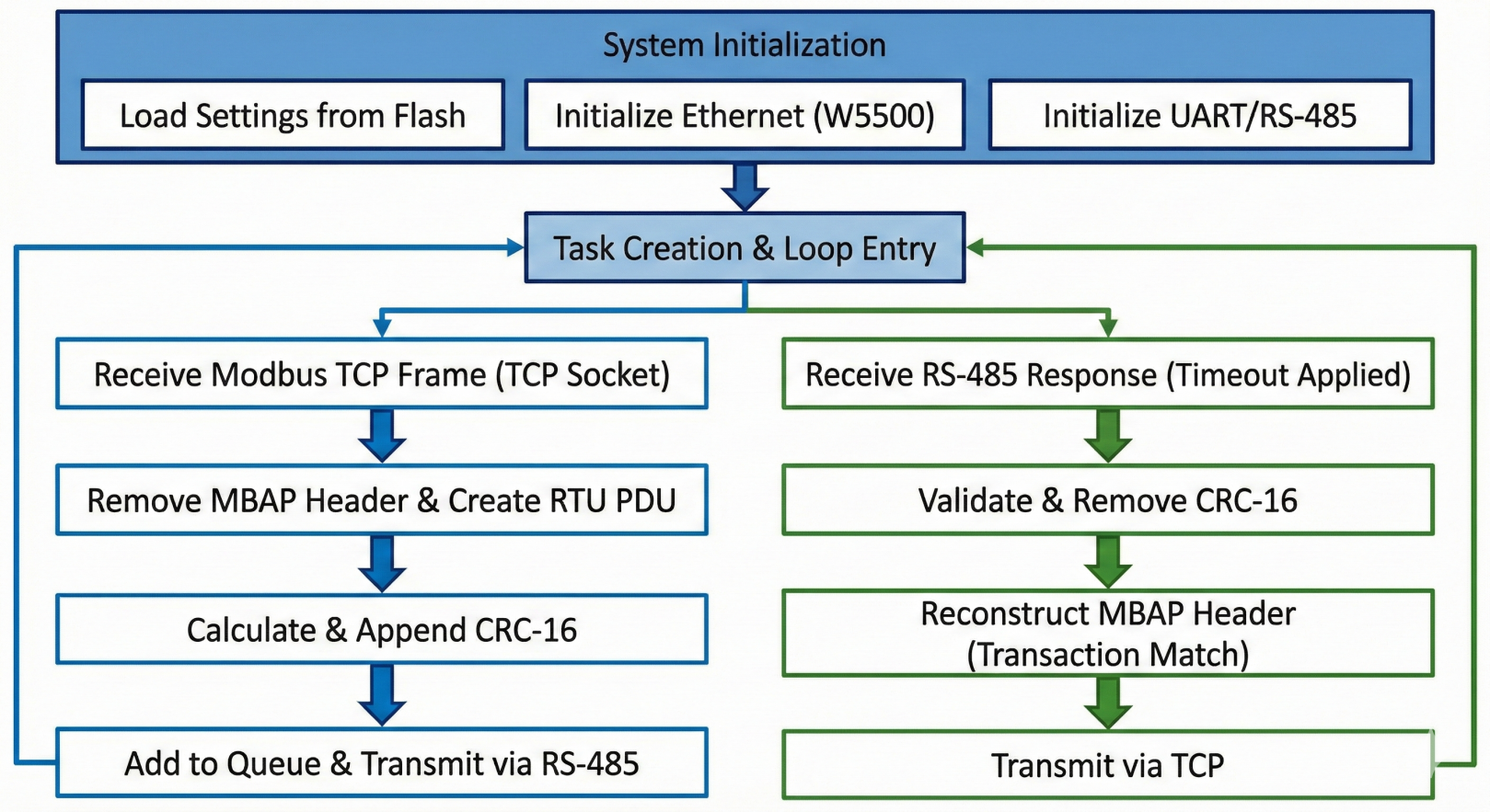 The W5500 does not perform the Modbus conversion itself. It handles TCP communication (port 502) socket TX/RX. The conversion logic—MBAP handling and CRC generation/verification—runs on the RP2040, and the processed frames are transmitted via the W5500 socket interface. This clear separation of responsibilities also helps debugging and stabilization.