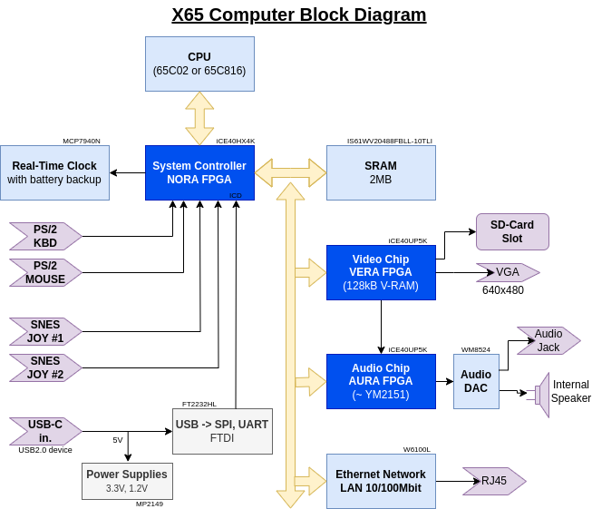 X65-SBC는 단일 보드 위에 65C02 또는 65C816 CPU, 2MB SRAM, VGA 출력, PS/2 키보드/마우스, 스테레오 오디오, SDHC 카드, USB-C 기반 디버그 인터페이스를 통합한 오픈소스 레트로 컴퓨팅 플랫폼이다. 구조적으로는 CPU가 중심이고, 메모리 맵과 주변장치 제어는 NORA FPGA가 담당하며, 비디오와 일부 오디오는 VERA FPGA, 오디오 합성은 AURA FPGA가 맡는다. 이 프로젝트의 핵심은 “옛 CPU 아키텍처를 직접 이해할 수 있는 단순성”을 유지하면서도, 실제 사용 가능한 입출력 장치를 현대 부품으로 재구성했다는 점이다.