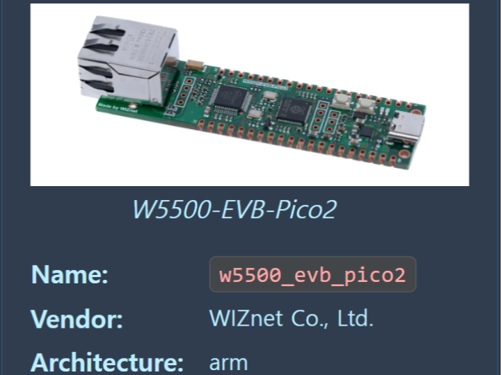 The official support of the W5500-EVB-Pico2 in Zephyr RTOS 4.2.0 combines the enhanced performance of the RP2350A MCU, the W5500 hardware TCP/IP offload engine, and the large-scale, stable Zephyr RTOS ecosystem.