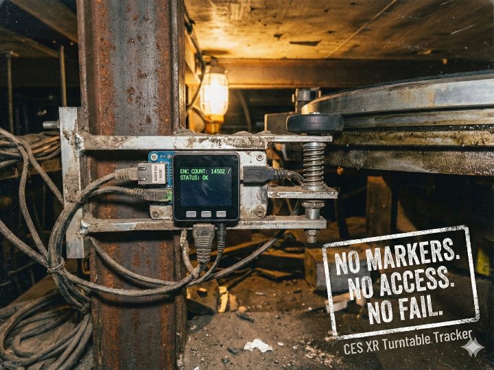 This Japanese note article documents a very practical “field device” built for a live event: tracking a vehicle’s rotation angle in real time while the car sits on a turntable—so an XR system can correctly align visuals to the car’s actual orientation.