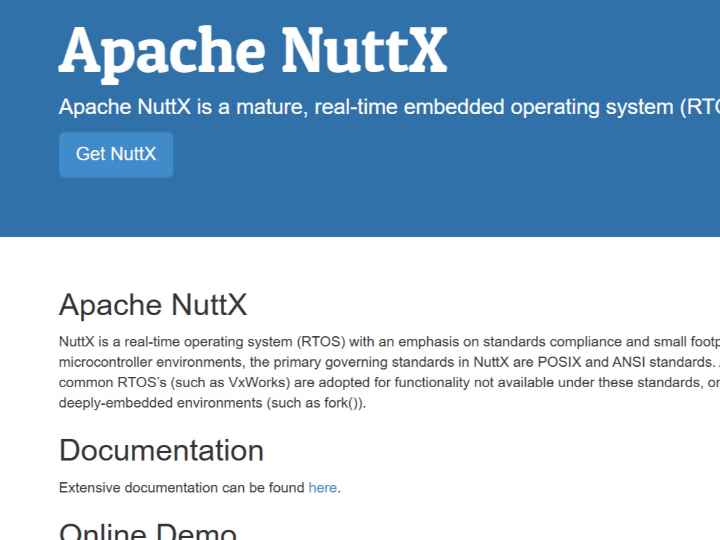 Apache NuttX Apache NuttX is a real-time operating system (RTOS) with an emphasis on standards compliance and small footprint. COMPONENTS PROJECT DESCRIPTION Documents Comments Write