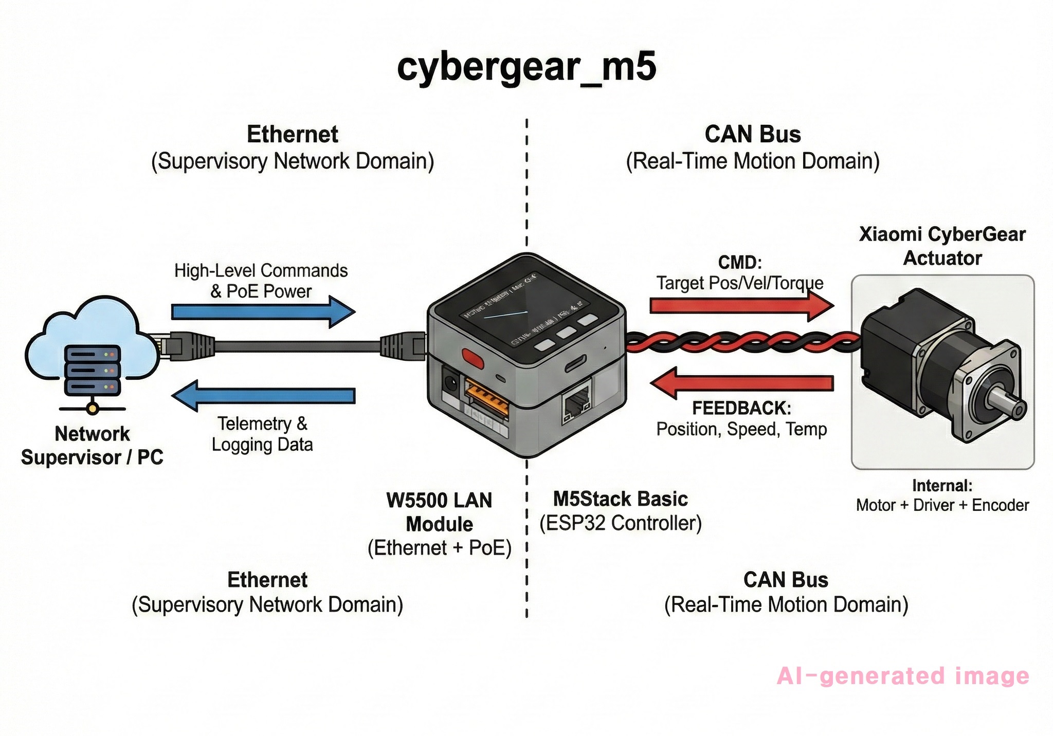 - Network Supervision: It allows the M5Stack to act as a gateway, receiving high-level commands or streaming telemetry (position, torque, temp) to a PC over Ethernet, while keeping the local CAN bus dedicated to real-time motion.