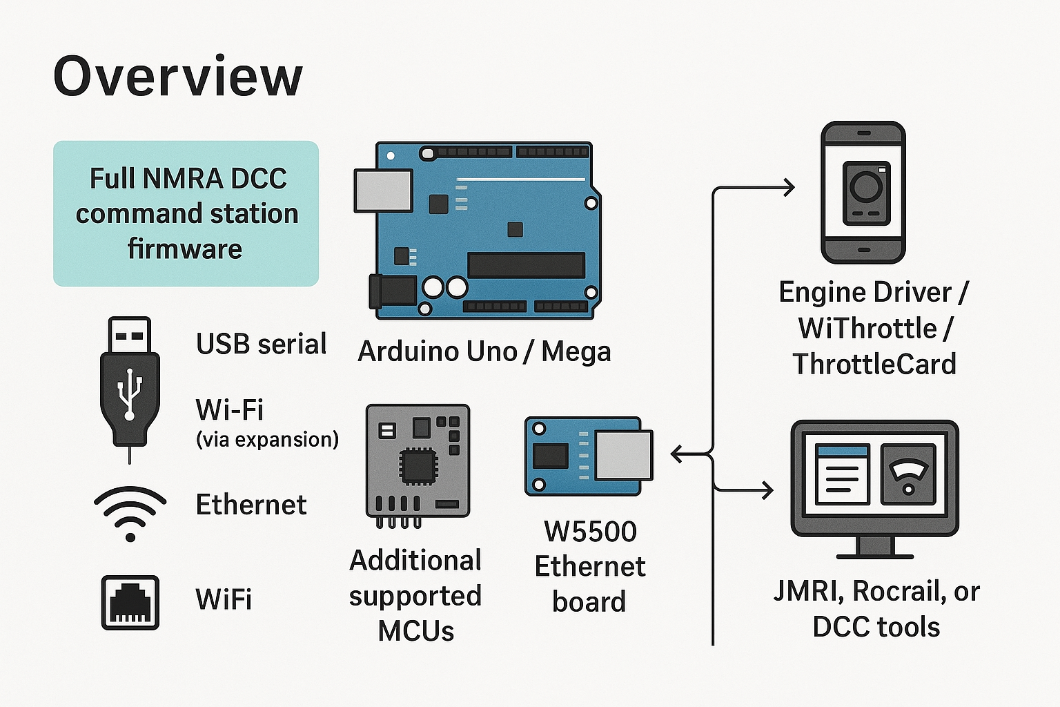 In other words: one open-source firmware, plus a handful of off-the-shelf boards, gives you a complete digital command station platform.