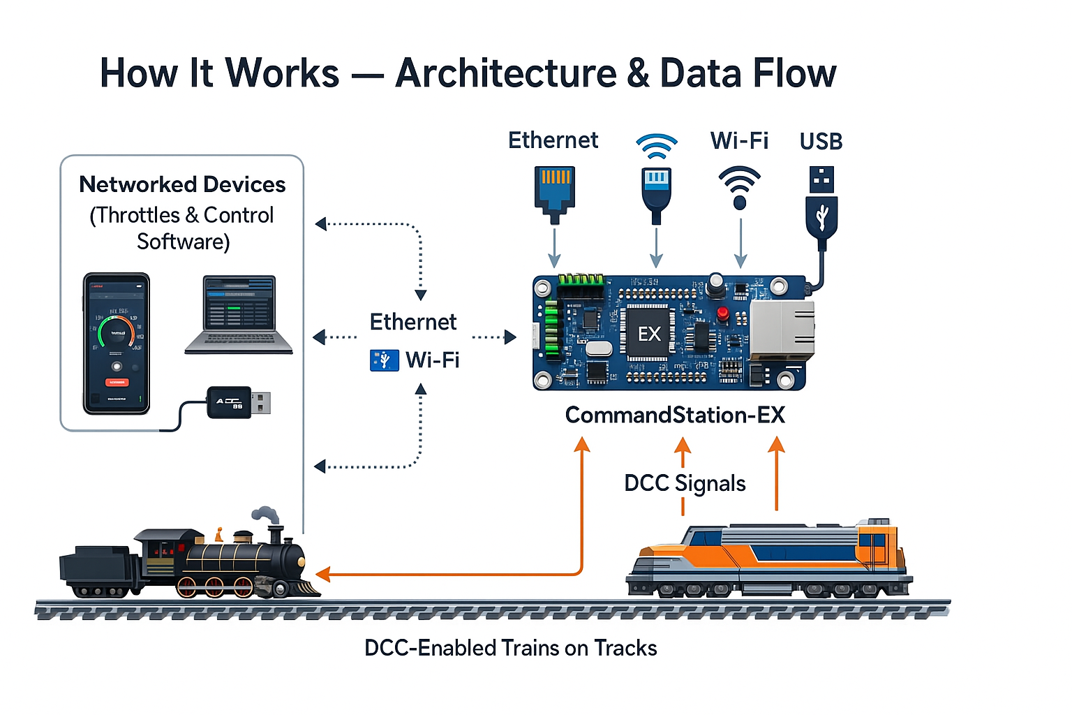 - JMRI lists EX-CommandStation as a supported command station, with dedicated connection instructions (USB, Wi-Fi, Ethernet).