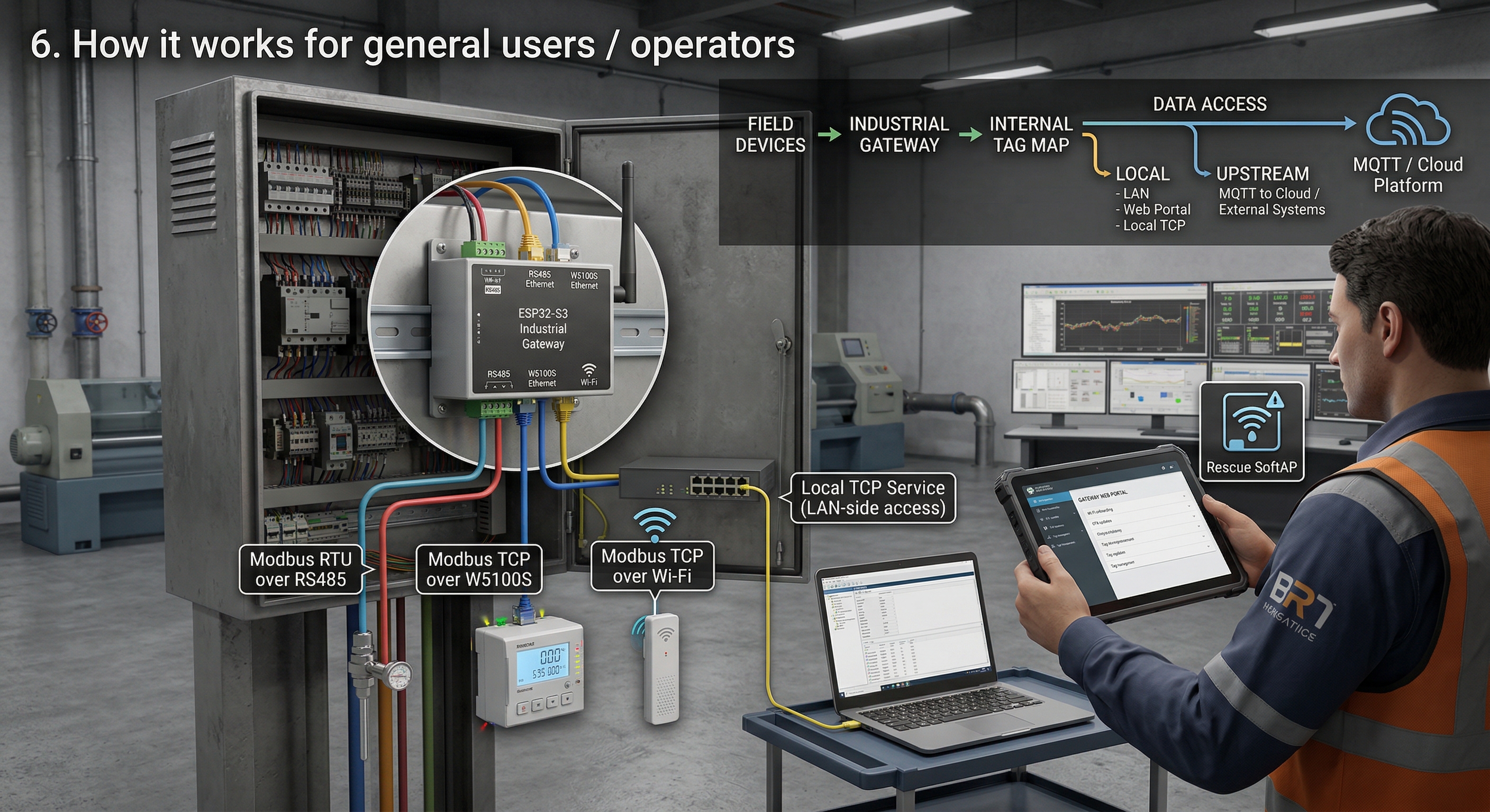 This firmware matters because it solves a real product problem: how to build a small industrial edge node that can speak to mixed field devices, offer local service and maintenance paths, and still connect upward to modern software systems. The visible architecture answers that problem directly by combining serial polling, wired IP, wireless IP, local UI, and MQTT in one image.