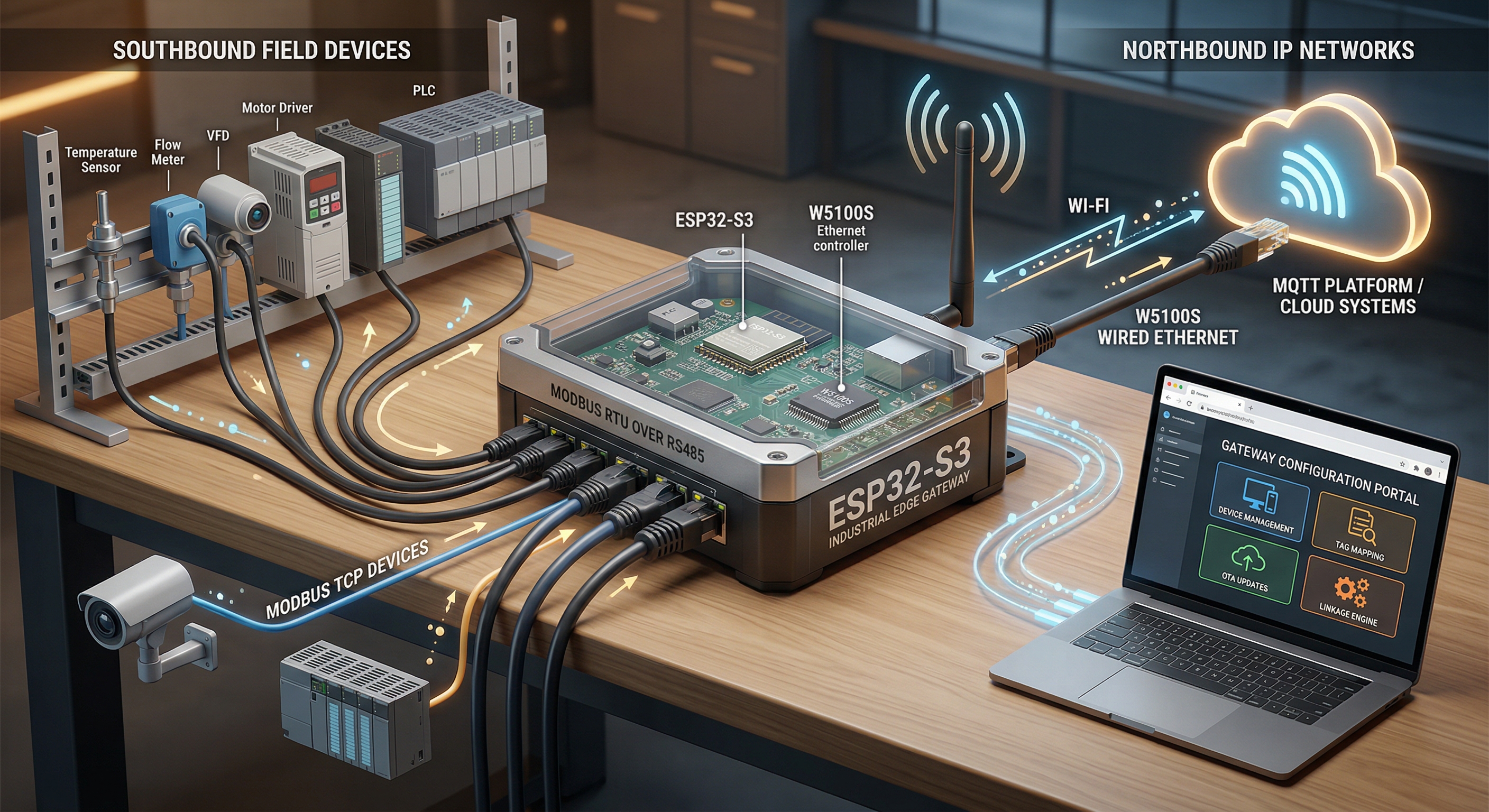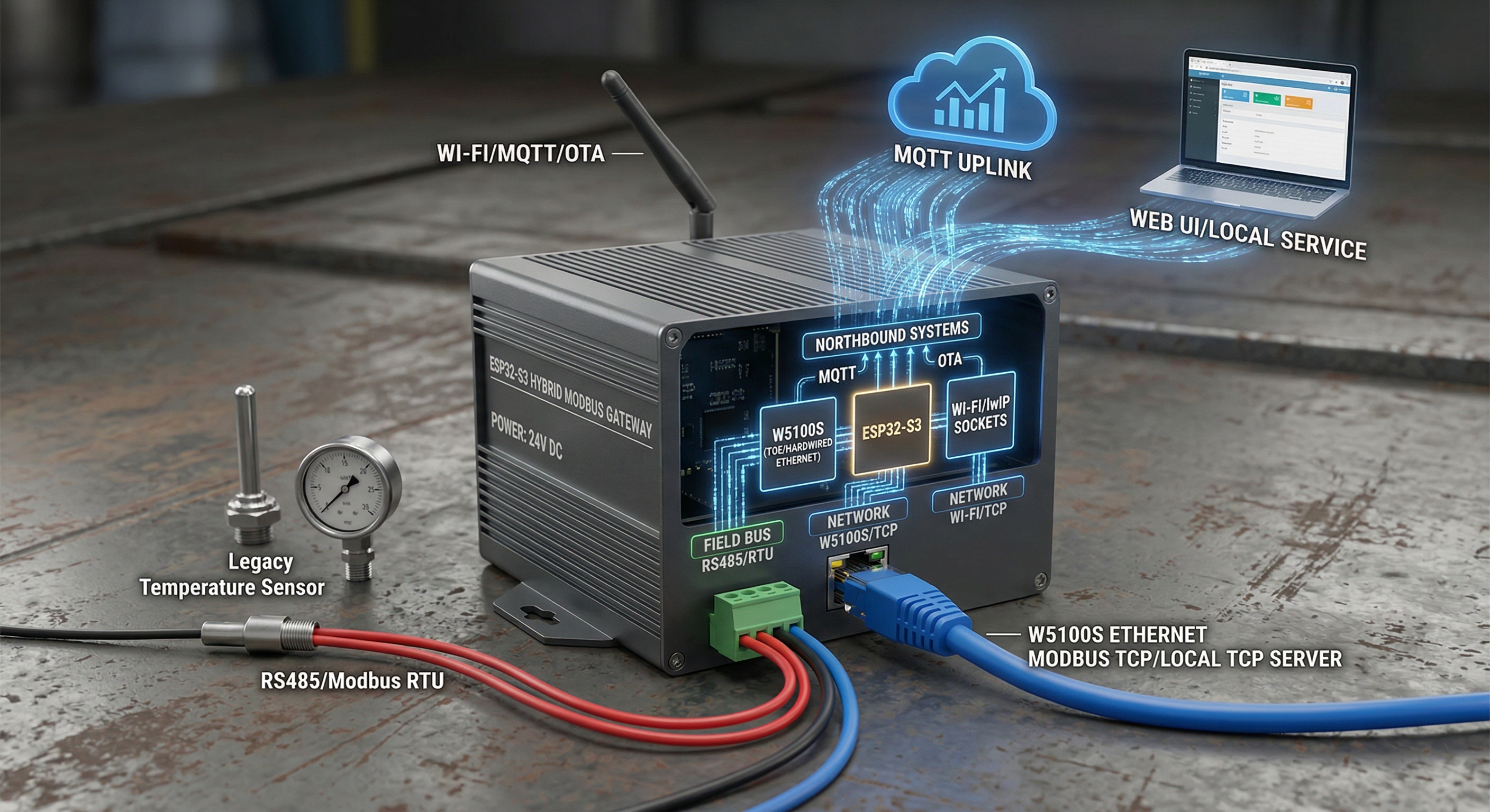 An ESP32-S3 industrial gateway combining RS485, Wi-Fi, and W5100S TOE Ethernet for Modbus TCP/RTU, web setup, MQTT, OTA, and hybrid edge control.