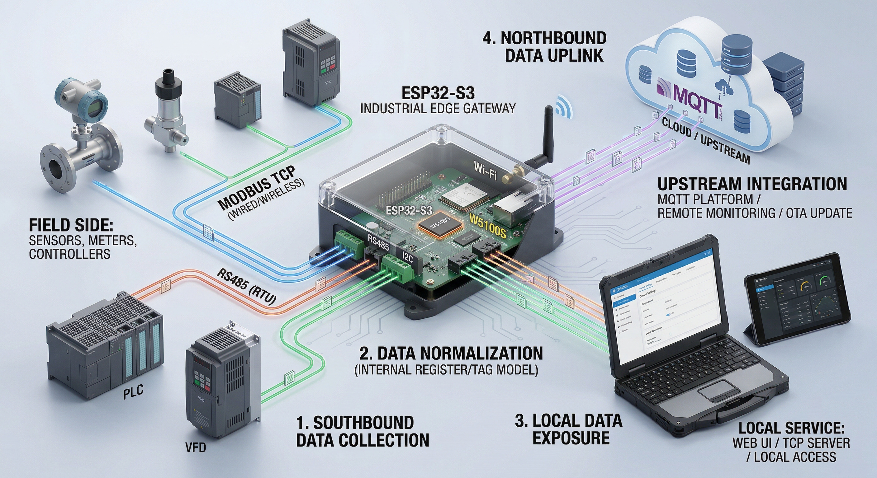 This project should not be read as a simple ESP32 networking repository or a generic Modbus example. The available materials show that it is application firmware for an ESP32-S3-based industrial edge gateway device. Its role is to sit between southbound field devices and northbound IP-based systems, collecting industrial data, normalizing it into an internal register/tag model, and exposing it through local and upstream interfaces. The startup flow initializes the filesystem, RS485, I2C, Wi-Fi, and W5100S Ethernet hardware, then launches the gateway’s TCP service, web UI, SNTP, MQTT, and linkage engine. That is the profile of a gateway appliance firmware, not a small protocol demo.